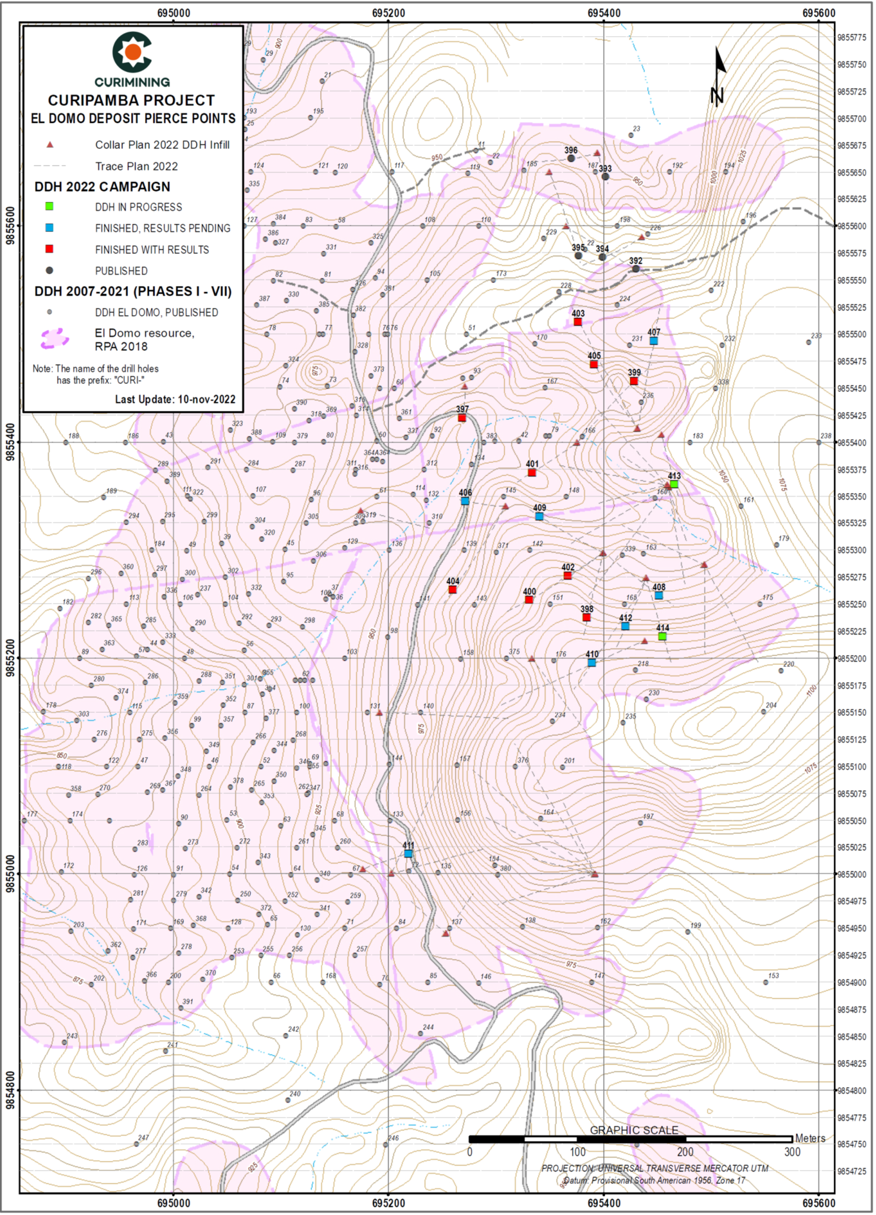 Toronto, November 15, 2022 – Adventus Mining Corporation (“Adventus Mining”) (TSX-V: ADZN, OTCQX: ADVZF) and Salazar Resources Limited (“Salazar”) (TSX-V: SRL, OTCQB: SRLZF) (collectively the “Participants”) are pleased to announce the additional infill drilling results from the underground portion of the El Domo volcanogenic massive sulphide deposit (“El Domo”) located within the 21,537-hectare Curipamba project in central Ecuador. The infill drilling program for the underground portion of the Mineral Resource at El Domo, as announced in the August 29, 2022 press release, continues with two diamond drill rigs.